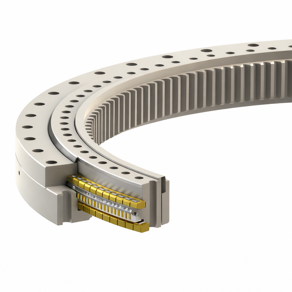 Three-row cylindrical roller internal gear slewing bearing, see Figure 3 The nominal diameter combinations of the rolling elements are: upper row/lower row/radial: 25/20/16, 32/25/20, 40/32/25, 50/40/25. Of course, for double-row unequal diameter balls, the ball arrangement is as follows: